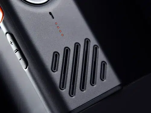 Un autre bouton PTT à l’avant — de taille agrandie, de forme circulaire et avec une texture semblable à celle d’un disque vinyle.